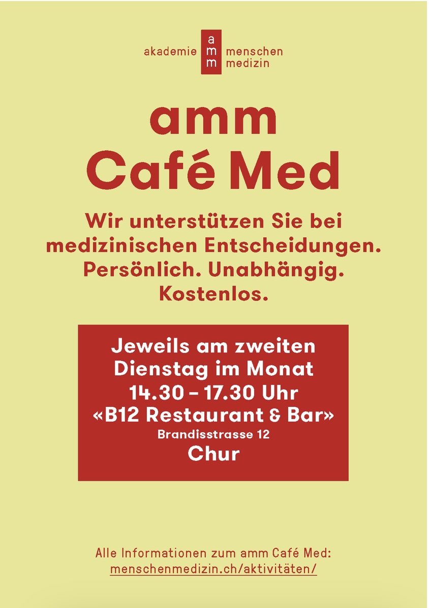 Das amm Café Med ist ein unentgeltliches Angebot der Akademie Menschenmedizin für Patientinnen und Patienten, deren Angehörige und Fachpersonen aus dem Gesundheitswesen.